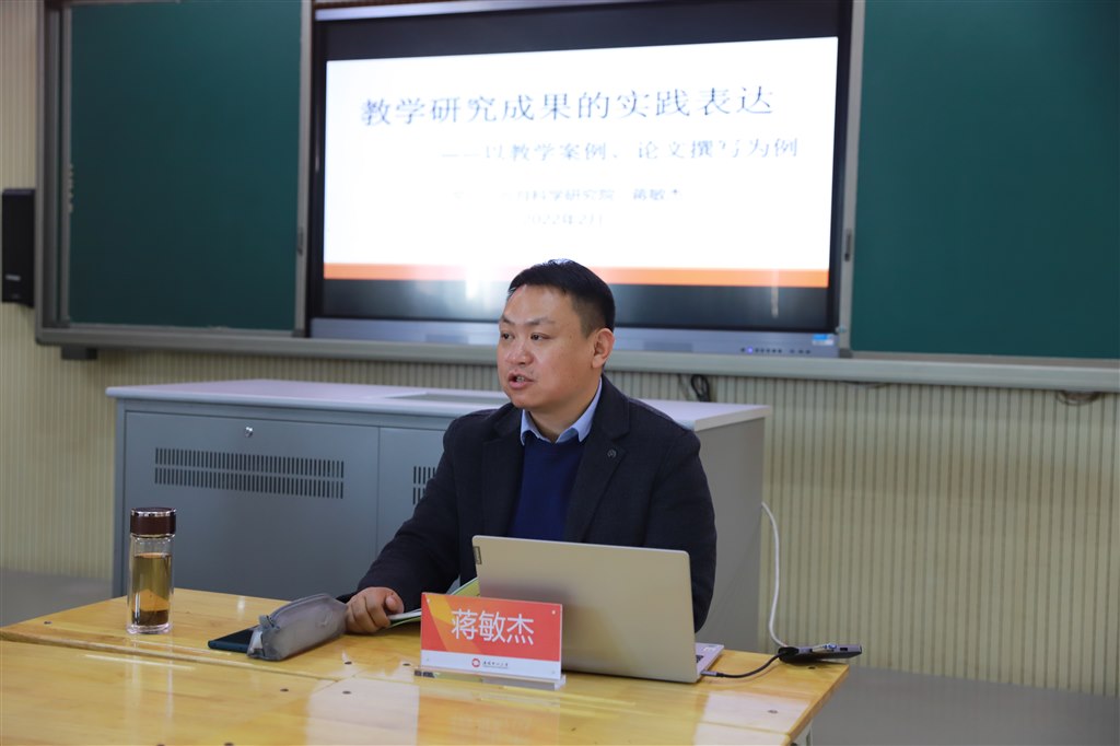 蒋敏杰校长进行专题讲座《教师教学成果表达——以教学案例、论文为例》。蒋校指出论文摘要以及关键词的重要作用。同时,通过实例,让教师理解读摘要就能读懂文章的大致内容,书写段落。同时,以常州市教科院院长潘小福的论文为例,对论文写作进行示范。