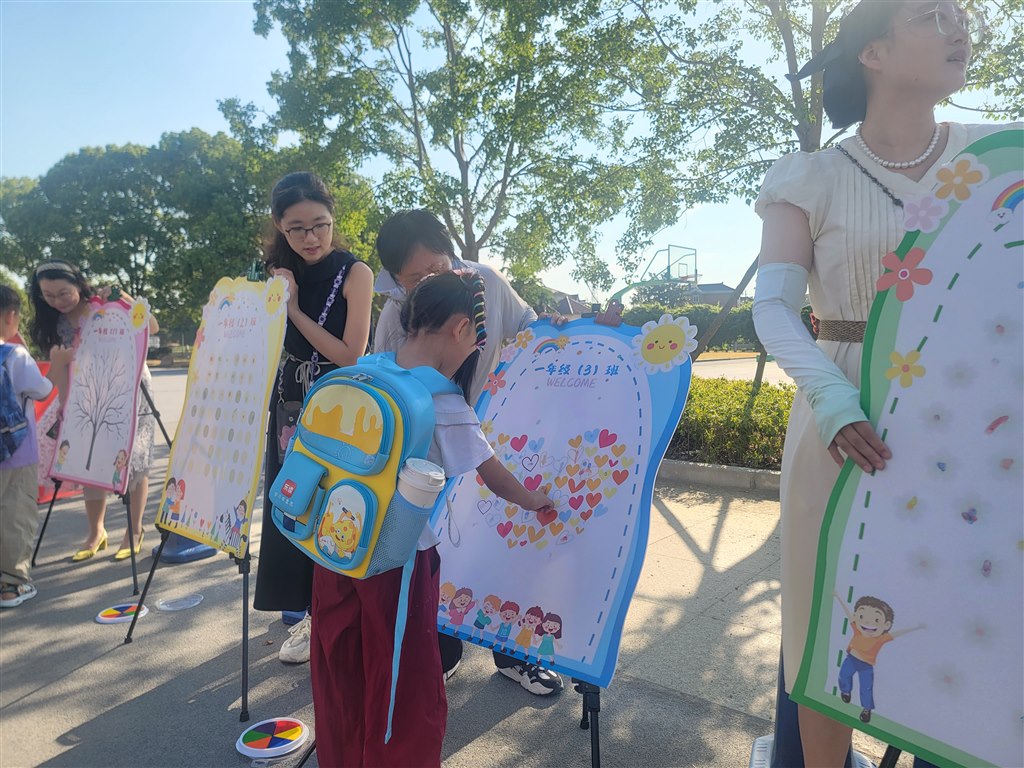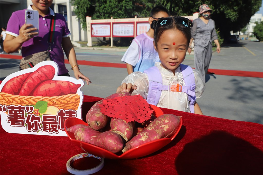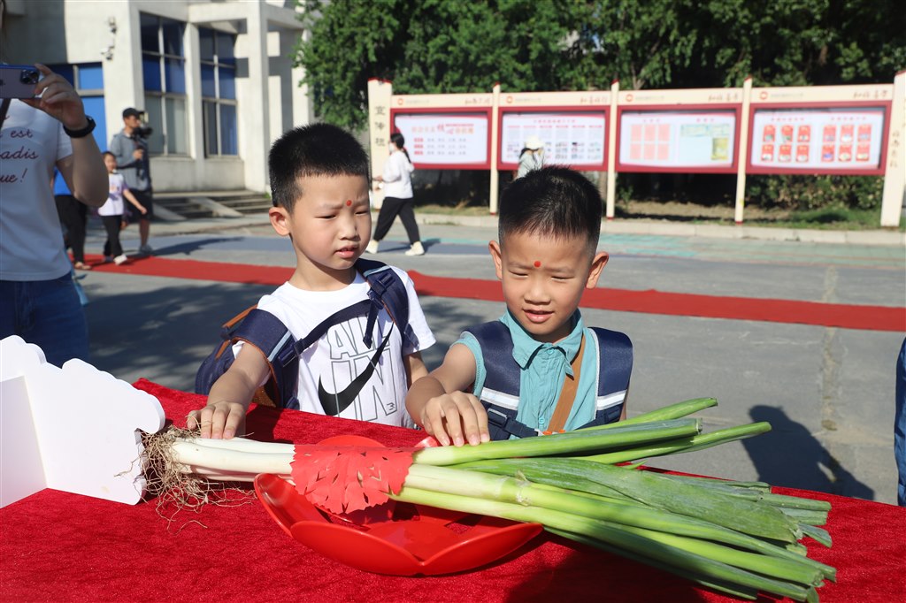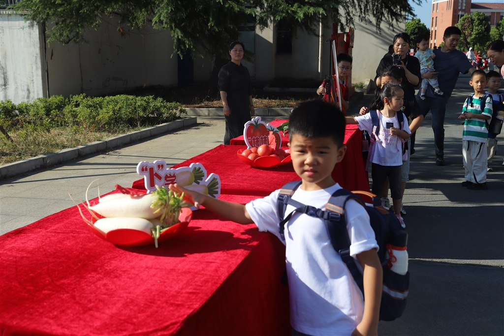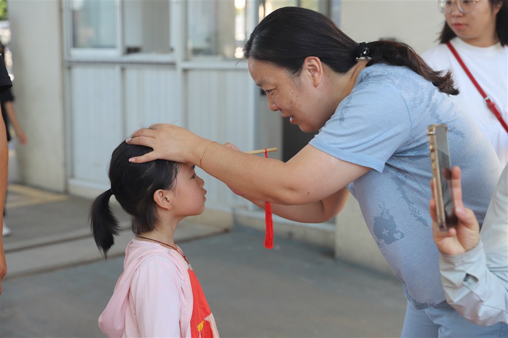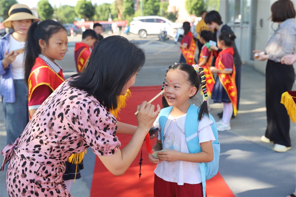 活动前期,校园已精心布置,“我们开学啦” 的标语映照着孩子们的期待目光,整齐摆放的书本与摇曳的五彩气球传递着对新生的热忱,也悄然埋下家国启蒙的种子。丁雄鹰校长与老师们早早守候在校门口,迎接新生到来。现场设置了朱砂启智环节,老师们为新生轻点额头;同时准备了大葱、萝卜、土豆等物品,供孩子们触摸,分别寄托 “聪明伶俐”“博学多才”“突飞猛进” 的美好期许,将启智愿望与爱国根基一同植入孩子心中,让个人成长与家国梦想紧密相连。