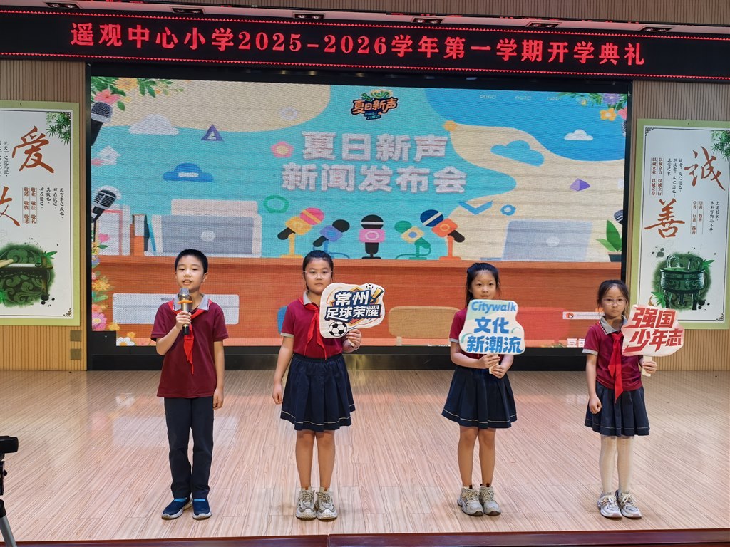 “夏日新声” 新闻发布会环节,四年级小主持人化身 “暑假播报员”,围绕 “常州足球荣耀”“文化新潮流”“强国少年志” 三大关键词,生动分享暑假里的拼搏、温暖与自豪瞬间,带领师生重温难忘的暑期时光。随后,学生中心储老师现场揭晓 “暑期实践小达人” 名单,那些积极走进社区参与志愿活动、探索非遗学习传统文化、用画笔记录家乡之美的同学依次走上领奖台,校长们为他们颁发荣誉证书,台下掌声阵阵。这份表彰既是对同学们暑期成长的肯定,也为全校师生树立了新学期的学习榜样。