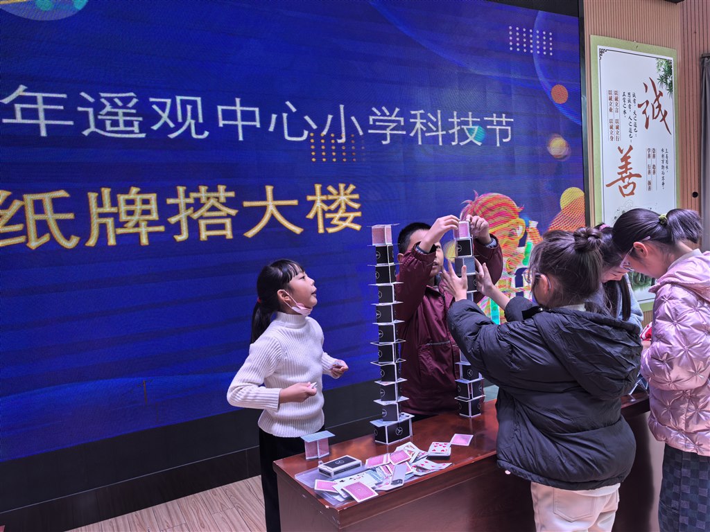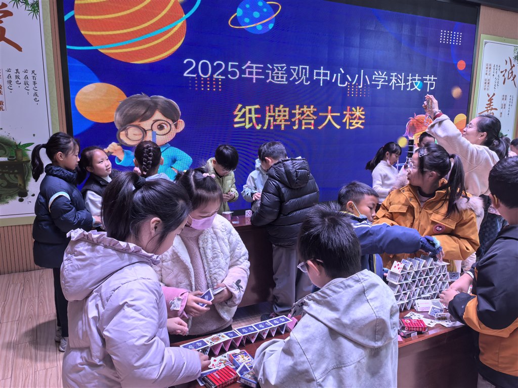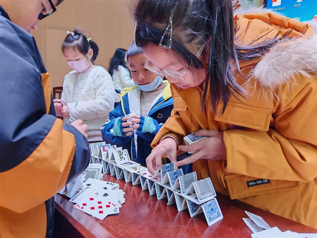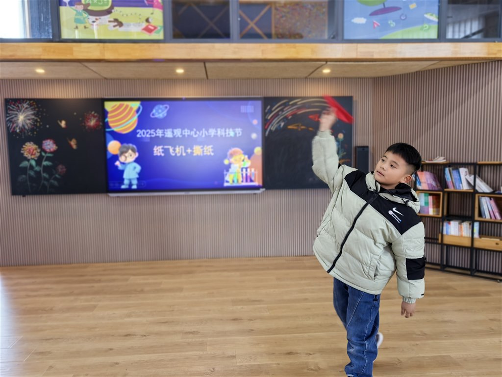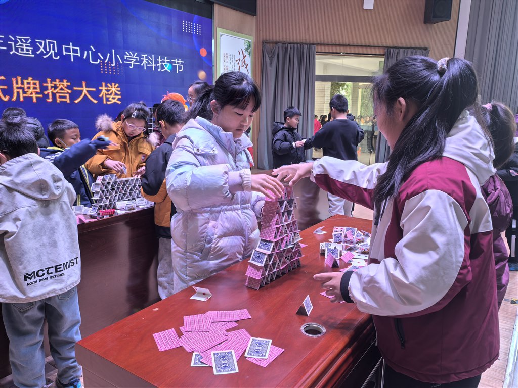 12月,科技节现场竞赛热血开赛!一、二年级“隔空救援乒乓球”,吸管吹气让小球飞舞;三、四年级“纸牌搭大楼”,30分钟内用折痕构筑稳固高塔;五、六年级“纸飞机+撕纸”,拼飞行时长也赛撕纸拼接长度。各班选手默契配合、脑洞大开,在实践中玩转科学原理。