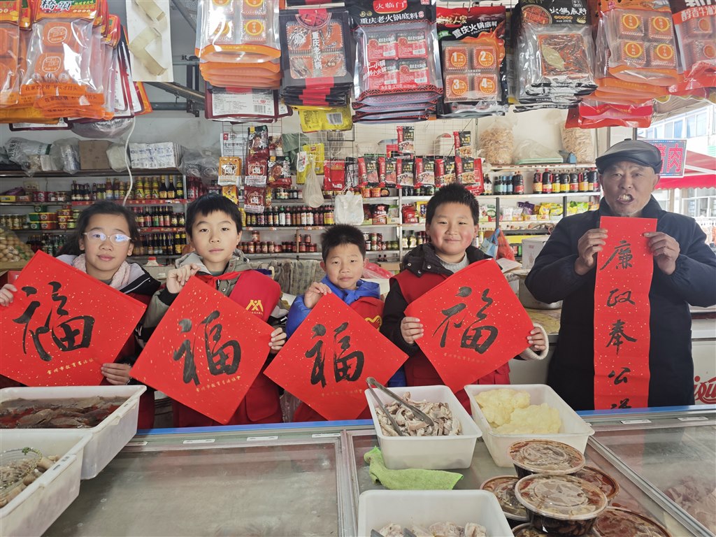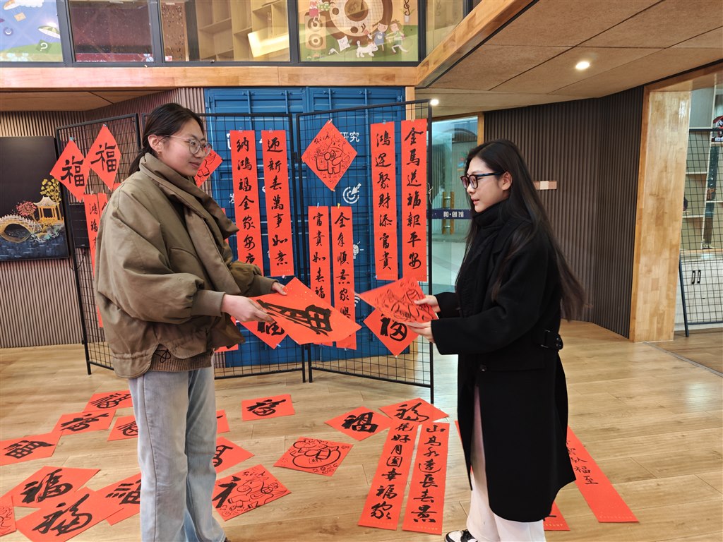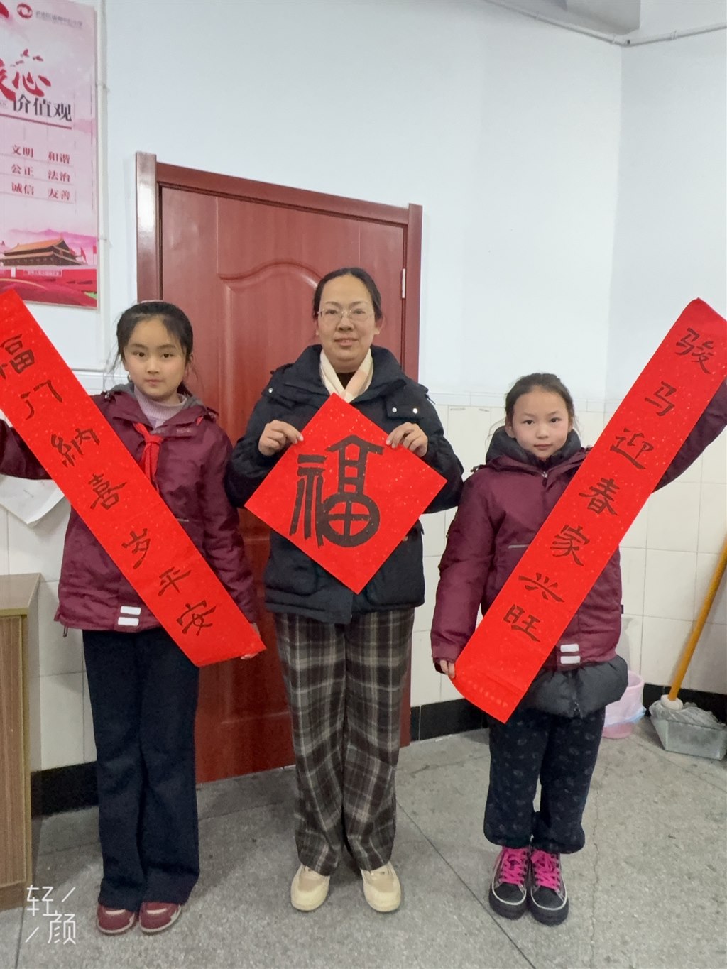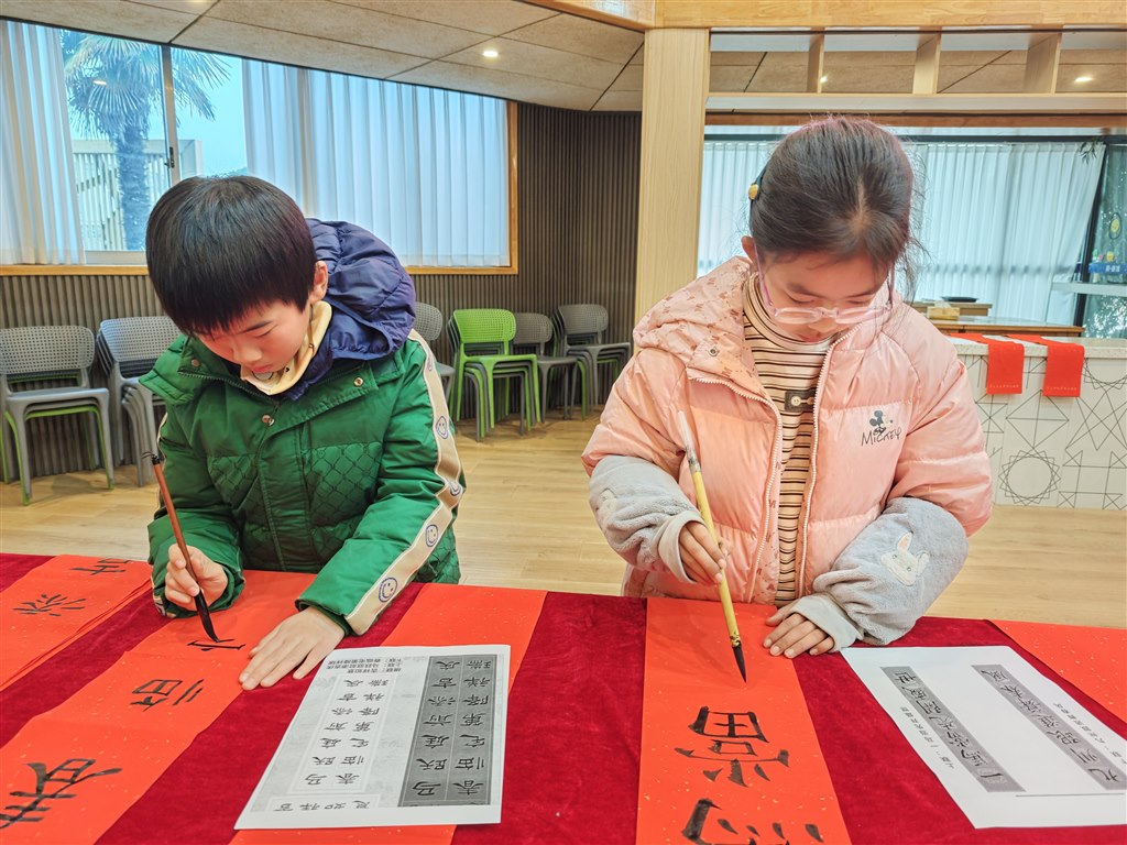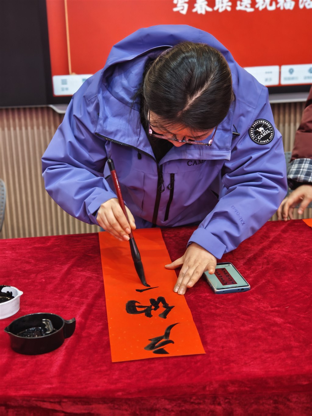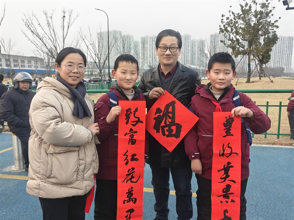 活动在学校和创馆举行,江莹莹、何华治两位指导老师带领教师书法爱好者及陆舒畅、韩琪玥等学生书法能手,现场挥毫书写贴合马年主题、寓意吉祥的春联与“福”字,展现了扎实的书法功底与对传统文化的热爱。随后,师生志愿者将这些满载温情的作品送到各班师生手中,送上新春祝福,让校园洋溢着欢乐祥和的节日氛围。